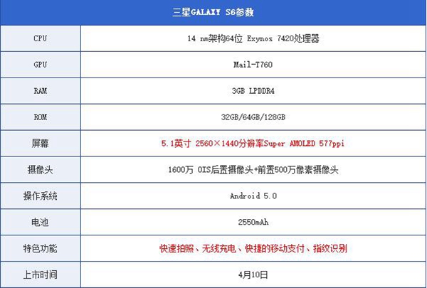首先,我们先来看看这款产品的详细配置,此次三星GALAXY S6采用的是64位14nm的Exynos 7420处理器.