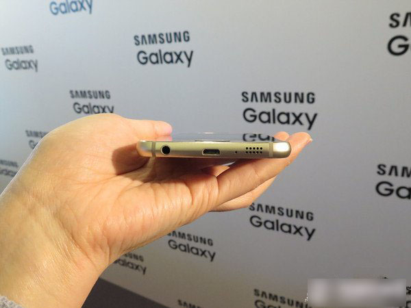 底部从左到右依次为3.5mm耳机插孔、充电接口、手机麦克风以及矩阵型扬声器,两端的金色带子是手机天线。三星GALAXY S6前面板有着明显的三星设计语言,这样用户对手机有一个更好的辨识度。