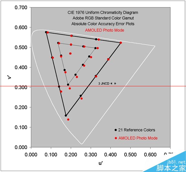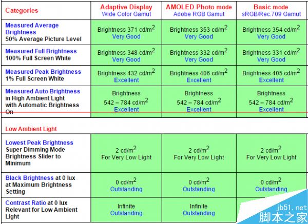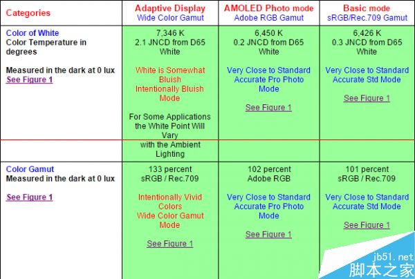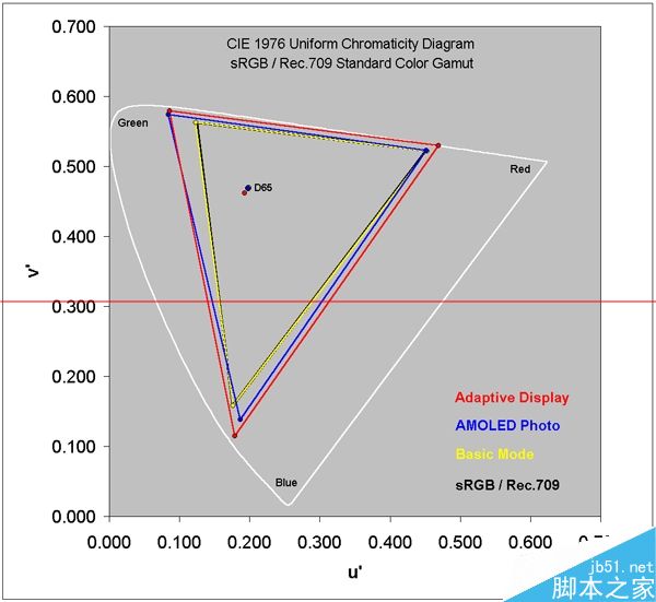 在默认的自适应显示模式下,S6的屏幕色域是最广的,AMOLED照片则次之,基本模式的色域最小,不过即便是色域最小的基本模式也达到了100%的sRGB。