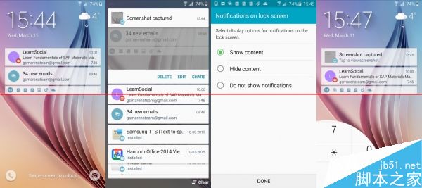 Galaxy S6的锁屏界面和已经推送了Android 5.0的三星手机基本相同,默认情况下能够显示两条通知,更多的消息会被隐藏,只显示对应的APP图标,在通知上下拉能够直接将所有通知都展开。