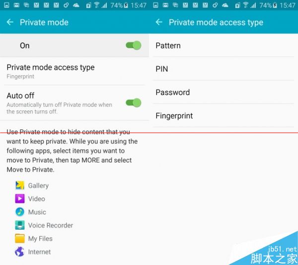 S6上面依旧有提供使用指纹加密的私隐模式,在进行适当设定之后,用户可以在指纹识别器上长按半秒钟来进行启用,按压式指纹识别器的易用度也远远高于前作的滑动式,私隐模式开启之后用户可以对选定的APP、图片等内容进行加密,关闭私隐模式之后对应内容将被隐藏。
