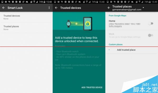 S6上面还有个智能锁定功能,用户可以设定一台受信任的蓝牙设备或者“安全区域”,这样在预先设定过的蓝牙设备连接到手机或者手机通过GPS定位到处于“安全区域”内之后,就能够跳过屏幕解锁进入系统,可惜的是“安全区域”只支持通过GPS进行设定,并不能设定为某个Wi-Fi网络。
