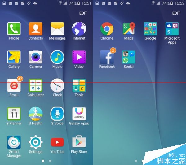 在主界面上,S6的操作以及整体布局设定和S5并无二样,不过可以将桌面图标的排布设定为4×4、4×5或者5×5,此外S6的壁纸加入了一点视差角度的动态效果,这个和iPhone上面的略有类似。