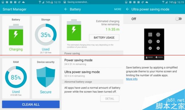 S6上面还有个特有的智能管家,基本就是个傻瓜式的手机维护工具,整个功能共分为4块,电池项目之中显示的目前电量和预估续航和预估充电时间,并且在出现异常耗电的时候还会通知用户,省电模式和超级省电模式的开关同样也在此处。