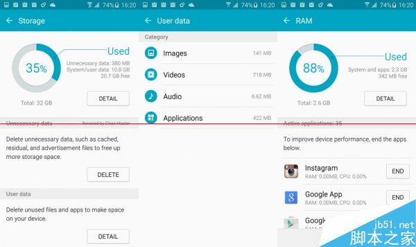 存储管理界面能够扫描系统之中不必要的文件以释放内存空间,RAM管理界面会显示目前开启的APP——虽然对于一台有着3GB RAM的手机来说内存用量似乎不需要过于担心。