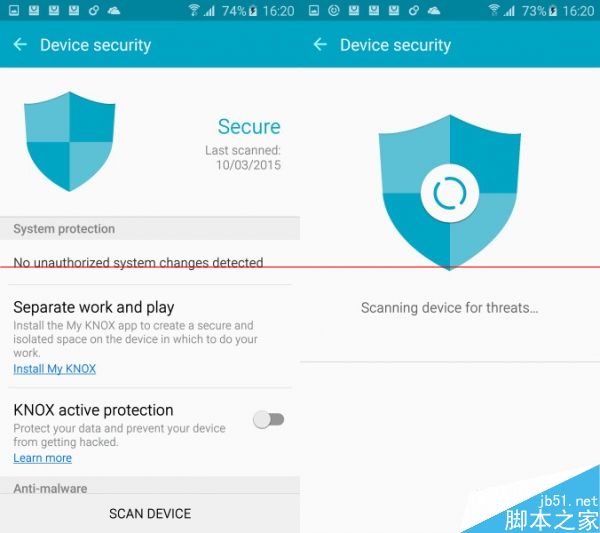 第四部分就是装置安全性了,KNOX功能会建立一个独立的工作区域,用户可以在这个区域之中存储资料和APP,默认是关闭的,如果用户有需要的话就需要在这里手动开启。在开启加密模式之后,对于系统的运行速度是有影响的,开机会慢一秒左右,因为在运行的时候手机会实时监测系统内核并提供保护,以防止被篡改,除了这个之外,S6还预装了McAfee提供支持的反病毒软件。