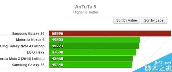 此外,本次S6原生使用了Android 5.0.2系统,这也就意味着S6全面获得了64位运算能力,对于32位的APP也能够很好的兼容,在64位版本的安兔兔评测的得分之中,S6可谓一骑绝尘,全面碾压市面上所有使用Snapdragon 805、810的智能手机。