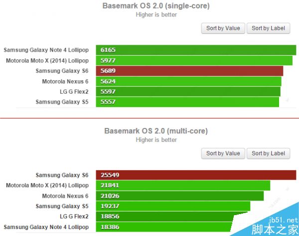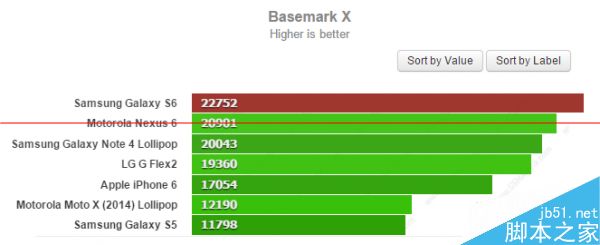 Basemark OS 2.0测试之中,S6表现同样顶级,但是略落后于使用810处理器的LG G Flex 2 5%左右。