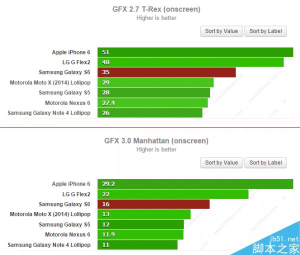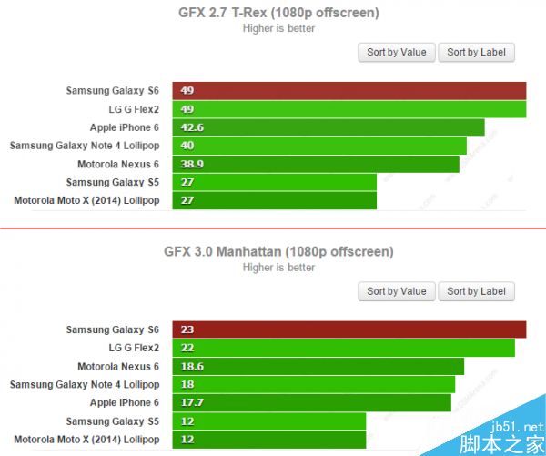 在关屏跑分之中,7420的Mali-T760 MP8顺利地战胜了810的Adreno 430,以及苹果iPhone 6/6 Plus上面A8处理器里面的GX6450,不过在实际体验之中,S6因为屏幕分辨率更高,所以游戏的流畅度或许面对1080p的竞品和更低分辨率的iPhone 6或许不会有太大优势。