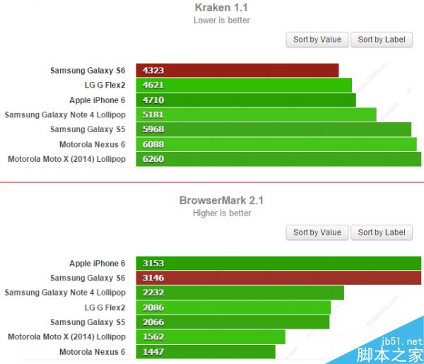 至于BrowserMark 2.1的综合评定之中,S6尽管有着超高分辨率的屏幕,但是依旧和向来表现优秀的iPhone 6战平,要知道后者的屏幕分辨率也就比720p稍高那么一点儿,总像素数量远远低于S6。