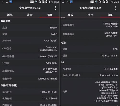 其它硬件方面,他使用了高通公司推出的骁龙410(MSM8916)64位四核处理器,主频为1.2GHz,内置2GB RAM和16GB ROM。使用基于Android 4.4版本的定制系统,内置电池为2200mAh容量。