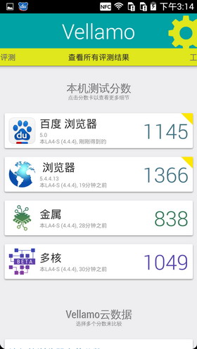 Vellamo是由Qualcomm(高通公司)开发的一个基准测试应用(类似于Neocore),它可以让你对手机浏览器的性能及稳定性进行测试,包括像Java脚本性能、渲染、联网和用户界面等。该工具的结果同样包括多个子项,但我们只取总成绩,分数越高则表明手机对浏览器的优化程度越高,网页浏览体验更好。这一环节的表现还可以,成绩属于中等水平。