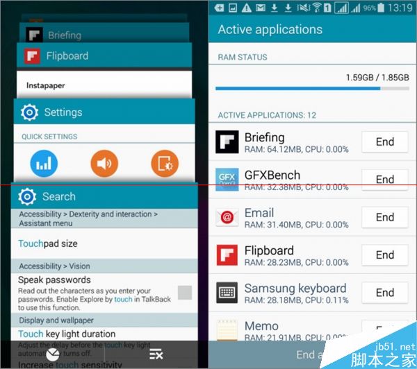 A7搭载的TouchWiz经过了轻量化,系统体验和S5、A5上的分别不大,与老版本最大的分别,是任务管理界面变成了类似安卓5.0的层叠卡片了。