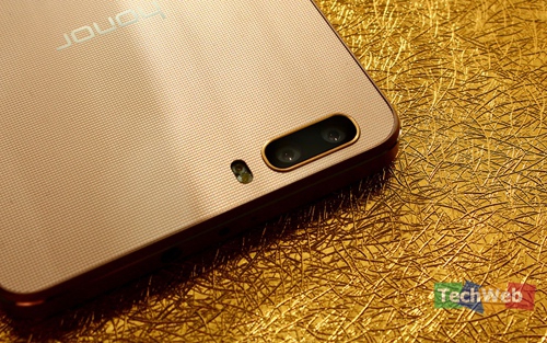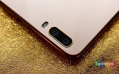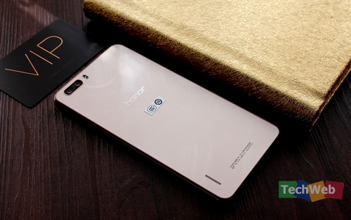荣耀6 Plus金色高配版背面,采用了非常独特的设计,后壳材质为玻璃纤维,星空纹理金色图案,在光线照耀下金色闪闪反光,纹理感更强彰显商务范,非常好看,这种纹理经过六层复合工艺雕琢而成的,工艺相当复杂。左上方后置摄像头采用双800万摄像头,双摄像头支持F0.95~F16可变光圈调节,旁边为LED闪光灯,绝不仅仅是简单的将两颗800万摄像头并排摆放那么简单,很多拍照新玩法其中运用的软件算法都需要两颗摄像头之间的距离十分固定,防止存在一丝一毫的偏移,所以此次荣耀6 Plus金色高配版采用了高强度的锌合金支架和点胶方案,保证双摄像头的位置不出现任何的位移。