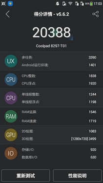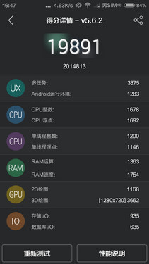 从测试成绩来看,大神F1极速版得20388分,红米2得19891分,它们之间仅相差497分,这和双方都采用相同的64位骁龙410处理器有关。不过,运行内存越大,CPU处理数据的速度也就越快,因此在前几个区块上,大神F1极速版的分数明显高于红米2。