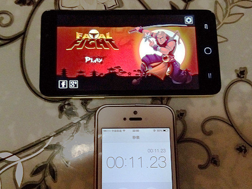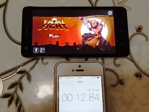 虽然双方在支持游戏类型方面无太大差异,但由于大神F1极速版采用了2GB RAM,所以在加载游戏速度上比1GB RAM的红米2要快一些。本次测试方法是同时点开游戏和秒表,当游戏加载完毕进入登陆界面后停止计时,从上图可以看到,大神F1极速版加载游戏的速度为11.23秒,红米2为12.84秒。