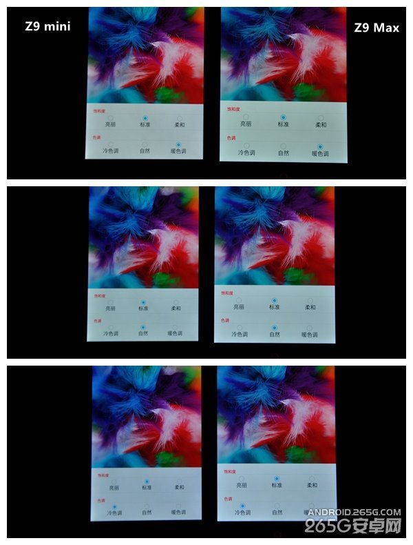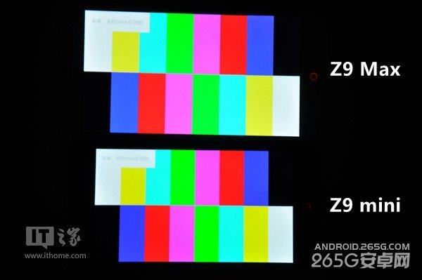 努比亚Z9 Max、Z9 mini均搭载了1080P分辨率夏普CGS屏幕,超过400 PPI的像素密度单纯讲精细度已经没有太大意义。我们看到,除了屏幕分辨外,努比亚官方还公布了Z9 Max以及Z9 mini两块屏幕的饱和度情况,其中Z9 Max为85%,而Z9 mini则为95%,将两者放在一起时,能够清晰的看到它们之间的差异。饱和度更高的努比亚Z9 mini在颜色上,显然要更鲜艳一些。
