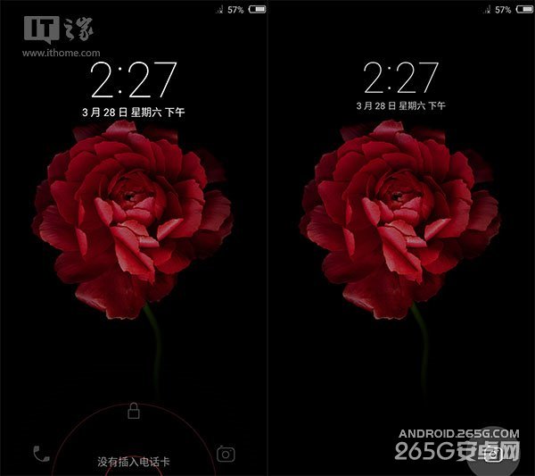 当点亮手机屏幕后,首先映入眼帘的是经过重新设计的锁屏界面,屏幕上方是醒目的时间和日期显示,右上角则是信号和电量标识,在屏幕下方,则显示了三大功能,可以选择手机解锁后直接进入主界面、拨号界面以及拍摄页面。