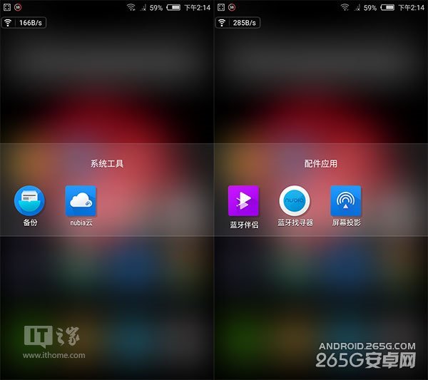 说道文件夹,我们不妨打开来看一下。这些文件夹已经被努比亚提前设置好了名称进行分类。用户可以很直观的通过文件夹的名字来大体了解文件夹的内容。同时,文件夹打开后呈现的是半透明的效果,这无形之中提高了nubia UI的美观程度。