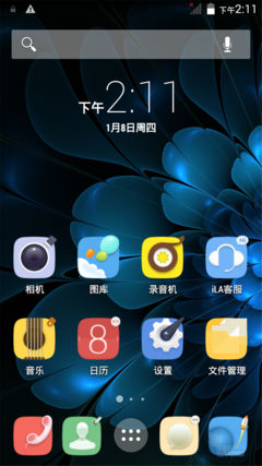 锁屏界面采用的四周滑动解锁,这类解锁方式在今天来看稍显有些复古;主界面图标采用圆角矩形设计,拟物化图案、立体设计,整体造型风格一致,但是过于复杂容易产生视觉疲劳。