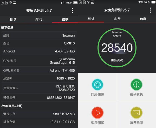 通过最新版安兔兔V5.7测试,纽曼纽扣手机安兔兔跑分超过了2.8万分,属于中高规格手机跑分水准,性能上值得肯定。