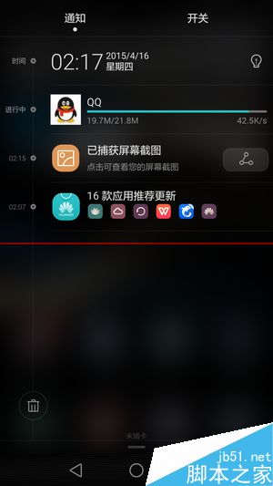 对于下拉任务栏,EMUI 3.1沿用了3.0的设计语言。其分为两大功能区,左边为通知栏,在这里大家可以看到时间、一些最新的通知或者未接来电等信息,而且左下角的垃圾桶工具设计得辟为人性化,不想要的通知信息可以下拉删除。而在右边则为一些常用工具的快捷开关栏,相比起很多UI的下拉二级任务栏,EMUI这样的设计相对来说显得比较直观。