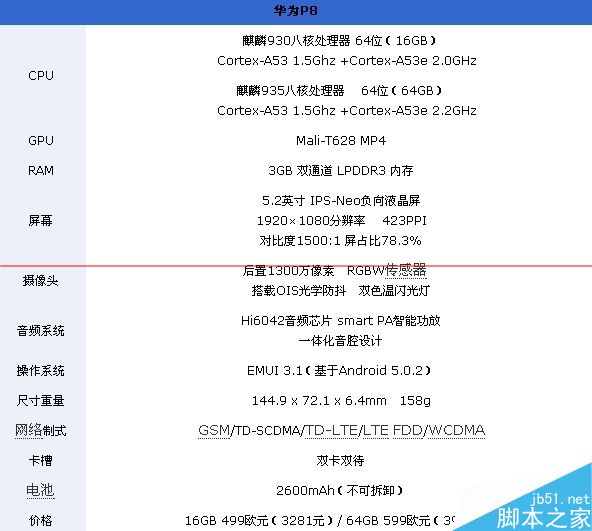 我们依然还是先了解下华为P8的整体配置信息。从配置清单上看,华为P8很明显分为标准版与高配版两个版本,而区分这两个版本的差别就在于SoC与存储容量。标准版的华为P8仅拥有16GB的存储容量,并且CPU也使用的是前一代的Kirin 930处理器,在性能方面要稍稍落后一些