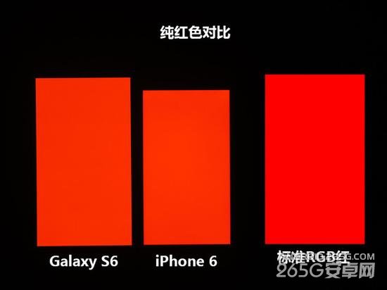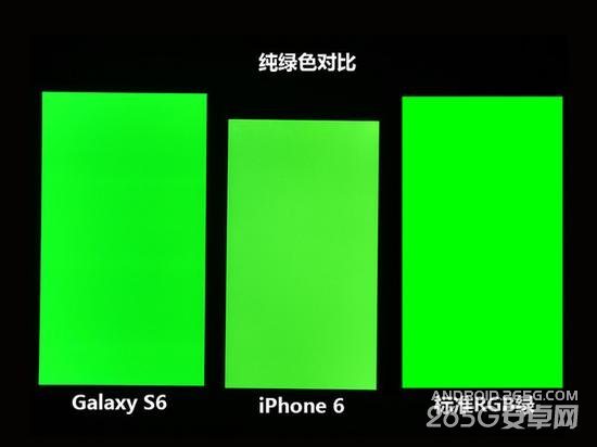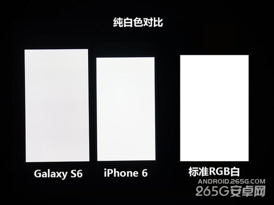 从上面的纯色屏幕采样图我们可以看到不管是搭配Super AMOLED的Galaxy S6还是搭配LCD的iPhone 6,其在纯色下的色彩还原度都是比较高的,实际显示的颜色与标准的RGB图差距不大。但在实际观察中笔者发现Galaxy S6的屏幕色彩比iPhone 6的浓郁,而后者在某些图上会稍微泛白。而在显示纯黑色时更加凸显Super AMOLED的优势。