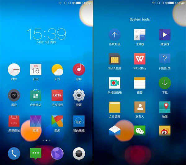 系统方面,乐视超级手机1运行的是基于安卓5.0深度开发的eui5界面,也称eco user interface。在乐视手机发布会中,贾跃亭将乐视手机定位为不仅仅是超级手机,而是一套完整的生态系统。乐视eui5界面是一套生态系统,内置了三种不同的桌面模式,包括“App桌面”,“乐荐桌面”以及“Live桌面”,下面我们具体看看。