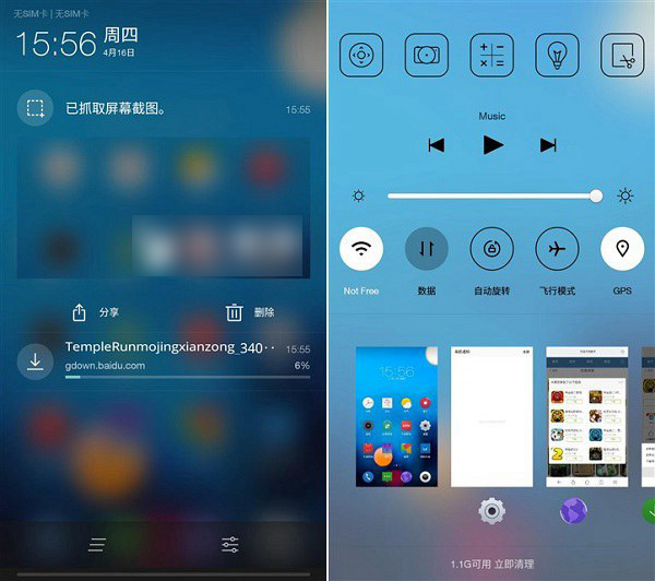 此外,eui5界面整体UI的风格较为扁平化,它的系统通知栏以及多任务和快捷开关界面都采用了磨砂玻璃效果,风格上比较“小清新”,如下图所示。