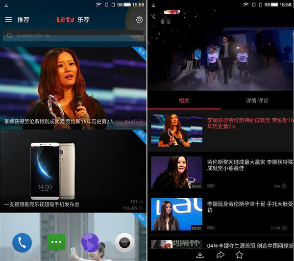 乐视超级手机1的“乐荐桌面”,是系统内集成的一个乐视推荐视频集合,它打破了应用和系统的界限,让用户可以通过桌面直接获得最新的动态以及视频资源。点击资源进入后,应用还会根据当前视频信息推荐相关资源。