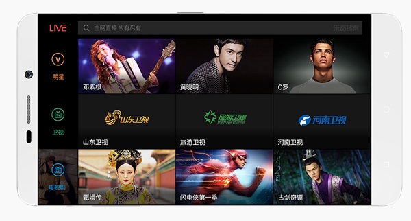乐视超级手机1中还有一个“Live桌面”,我们可以通过点击桌面上的“Live”图标进入。它和电视直播的桌面类似,提供九宫格样式的视频封面显示。同时它支持3路直播视频流实时传输,而且直播节目的资源也十分丰富。