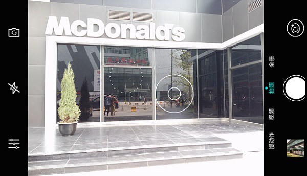 拍照界面方面,乐视超级手机1采用了类似iPhone的极简拍照界面,手动选项基本是HDR、倒计时拍照等基础功能,底部在为慢动作,抠图,全景等操作,如下图所示。