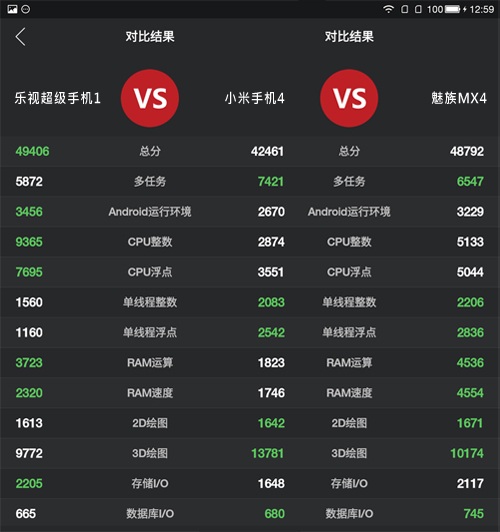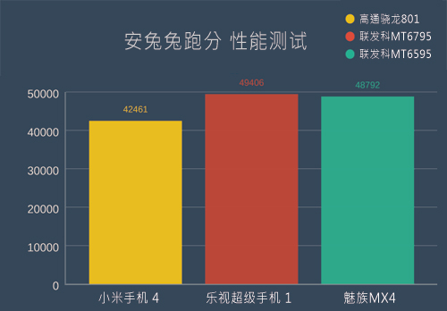 通过测试来看,乐视超级手机1安兔兔跑分高达5万分,比4万分的魅蓝Note高出不少,比搭载高通801四核的小米4手机跑分还高。不过,联发科芯片在图形性能方面比如高通平台,其GPU表现不如高通801四核处理器,不过比高通615八核更强一些。