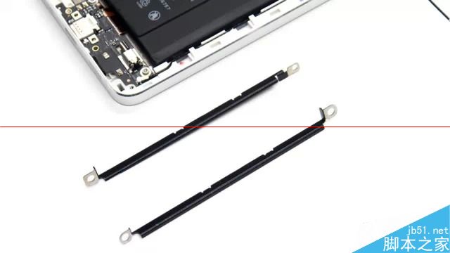 f、按照常理来说,完成前面的操作就可以直接拿起主板,乐1却不是这样,因为还有2个小的点需要注意。一是中框内部侧边有1个白色的卡子,它们将主板牢牢地卡住,需要先松开卡扣。二是电池两侧多了两条金属件,在遮挡射频线的同时也起到了加固主板的作用,它们上下都有一个圆孔部分,套在了主板固定螺丝的螺母上,相当于把主板夹在中间,取这两个金属件的时候也要小心,最好用镊子或者金属撬棒,从上部一点点撬起,否则容易弯折变形;