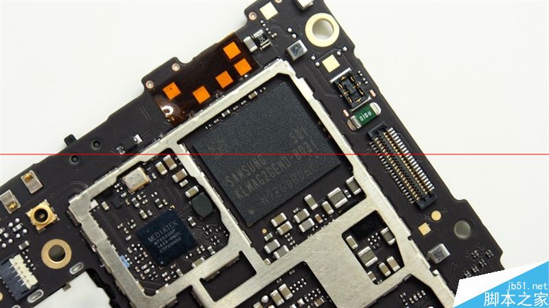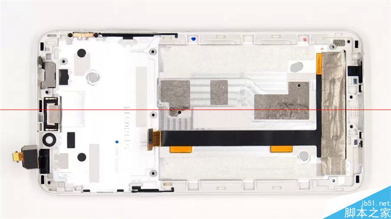 机器采用三段式结构,整体并不复杂,去掉固定螺丝之后,拆解基本就非常顺畅了,其中有一个小细节需要注意,电池两侧多了两条金属件,在遮挡射频线的同时也起到了加固主板的作用,这在其他同类型结构的手机中并不多见。