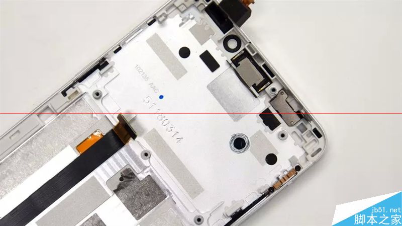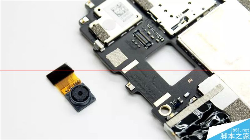 后盖采用卡扣式按压设计,唯一不同就是在摄像头周围多了两条封胶,应该是出于固定和密封考虑。打开后盖,乐视乐1给人最大的感觉就是简洁、干净,黑色背板、主板、螺丝与白色注塑相得益彰,细节处理到位,装配也非常用心。