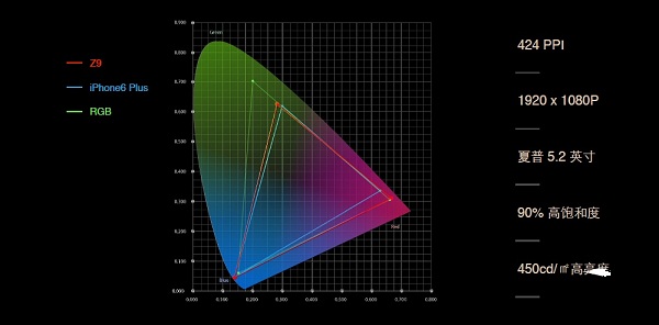 首先先来说说显示效果,nubia Z9仍旧选择了夏普显示屏,尺寸5.2英寸,分辨率为比较主流的1080p。其屏幕亮点在于高饱和度与高亮度,当然,就和发布nubia Z9 mini与Z9 Max时一样,nubia认为nubia Z9的屏幕显示效果是完全可以秒掉iPhone 6 Plus的。上面这张色域图,大家参考一下就好。