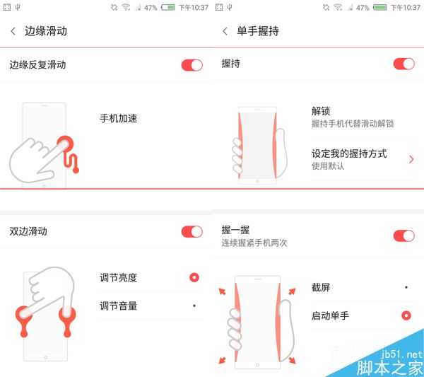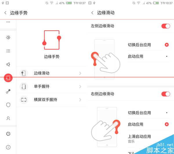 1、边缘滑动中可以提供左侧及右侧外边缘的滑动,可以用来切换后台应用或是启动应用。如果在边缘一侧反复滑动的话能实现手机一键加速的功能。双边对称式滑动则用来实现亮度调节以及音量调节。