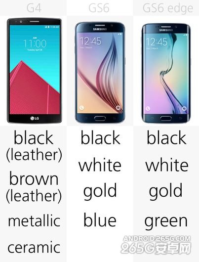 皮质版和塑料版的LG G4都提供了两种颜色供消费者选择,而Galaxy S6/S6 Edge则有四种颜色。
