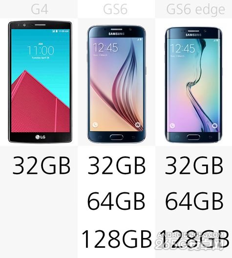 LG G4目前仅仅只有32GB的内置存储。而三星的两款旗舰机型提供了32GB/64GB/128GB三种存储型号。