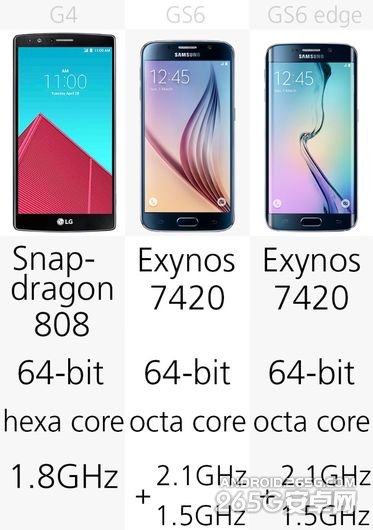 HTC One M9和LG G Flex 2同时使用了高通骁龙810处理器,但是在G4上可能考量到过热等问题,LG退而使用了高通骁龙808处理器。而三星则是使用了自家的Exynos处理器。
