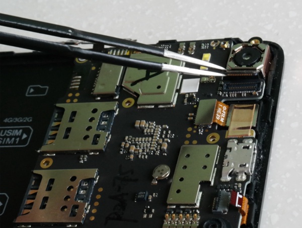 8、拨开前置摄像头连接排线卡扣