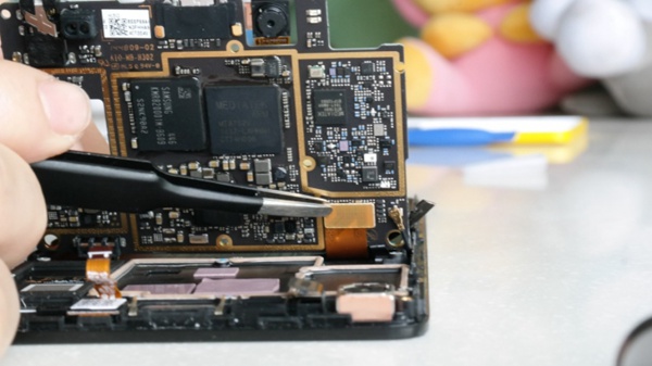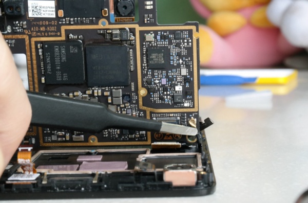 因为主板连接话筒及振动器的排线是焊锡的主板上的,无法直接取下,故本次拆机就到这儿了,为方便查看主板背面的芯片情况,可以揭开电池槽的贴纸,稍稍提高排线,便于拍摄。