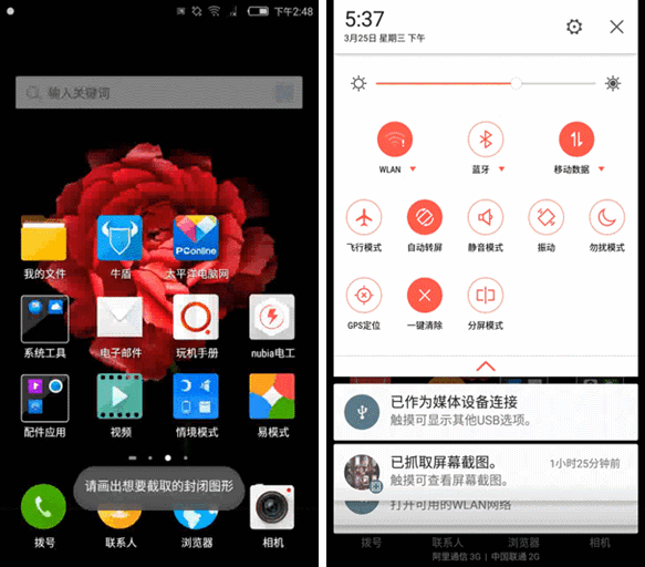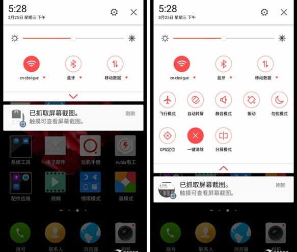 此外,nubia UI 2.8.1也同样拥有通知栏,下拉通知栏同样是简洁的风格,单次下拉只会占屏幕一般的位置,再次下滑会出现更多的功能菜单。白底与图标的红色轮廓同样很有nubia特色,操作起来还算便捷,如下图所示。