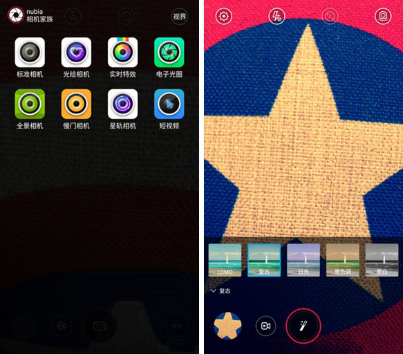 此外,努比亚Z9 mini还有一个“相机家族”模块,只有我们用手向右滑动或是在手机主界面最左侧一屏便可将其调出,在相机家族中,我们可以看到自己熟悉的星轨、光绘、电子光圈、实时特效、全景、慢门、视频等模块。