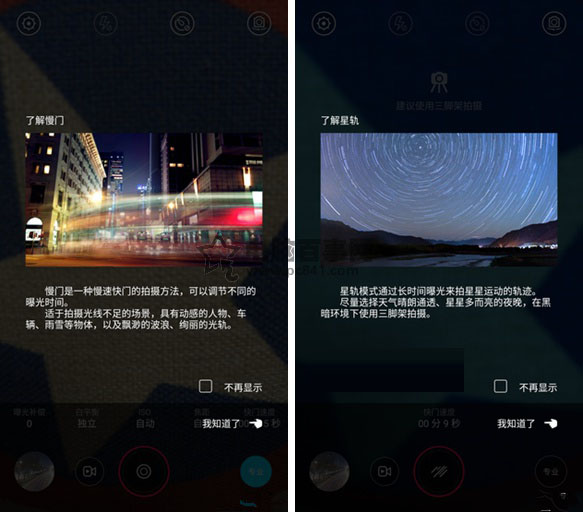 全景功能我们在这里不做赘述,实时特效的功能类似于照片中实时添加的滤镜,是一种所见即所得模式,这种功能还算常见。而星轨、光绘可以算是nubia的特色,将原本需要相机实现的拍照体验移植到了手机中。在弱光环境下通过光源进行绘画,或是长时间拍摄出星轨的轨迹,这些都能够通过nubia Z9 mini实现,当然,上一代的nubia Z7系列也没有问题。其他功能我们通过截图中的介绍可以了解一二,不过这些功能更适合专业的手机摄影爱好者,同时在拍摄时你也需要准备一个专门供手机使用的脚架。以电子光圈为例,这类拍摄需要通过长时间曝光来弥补手机拍照中的不足,如果手持手机则可能出现抖动、拍虚照片,而脚架能够保证照片的清晰画质,同时结合其特色功能以获得更好的拍照效果。
