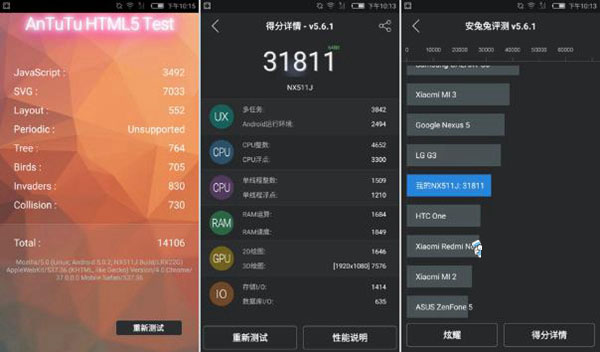 在安兔兔测试中,努比亚Z9 mini的HTML5得分为14106分。安兔兔跑成绩为31811,领先HTC ONE,紧追LG G3。