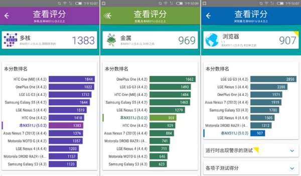 最后在vellamo评测中,得知多核得分1383、金属得分969、浏览器得分907。