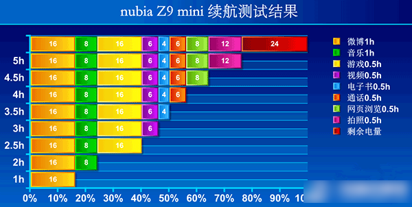 通过对该机进行5小时续航测试,发现nubia Z9 mini还剩下24%的电量,与iPhone 6剩余22%电量的成绩相比,nubia Z9 mini明显更胜一筹,很明显是2900mAh的大电池发挥了应有的作用。下面我们来看看各功能的耗电量: